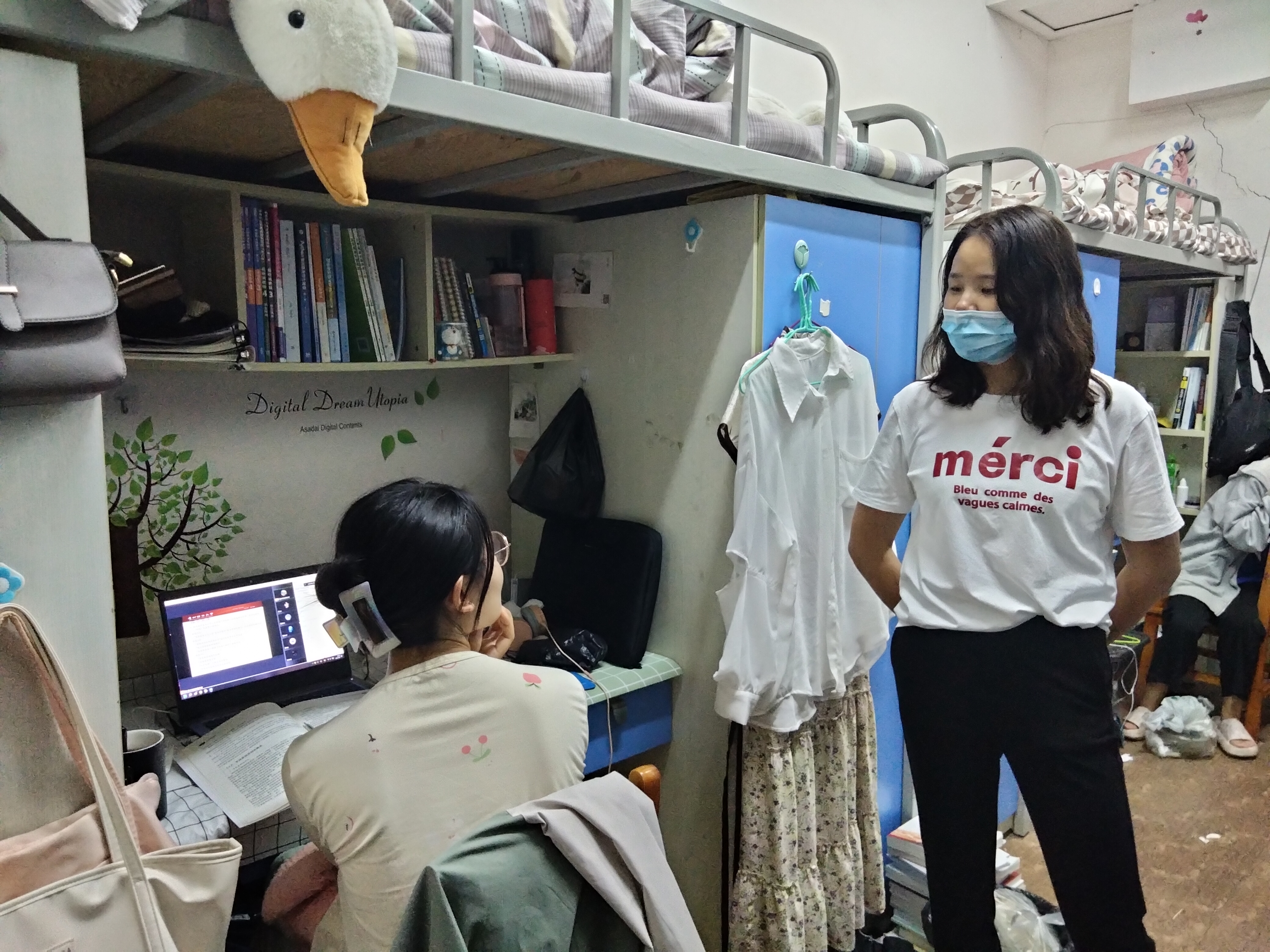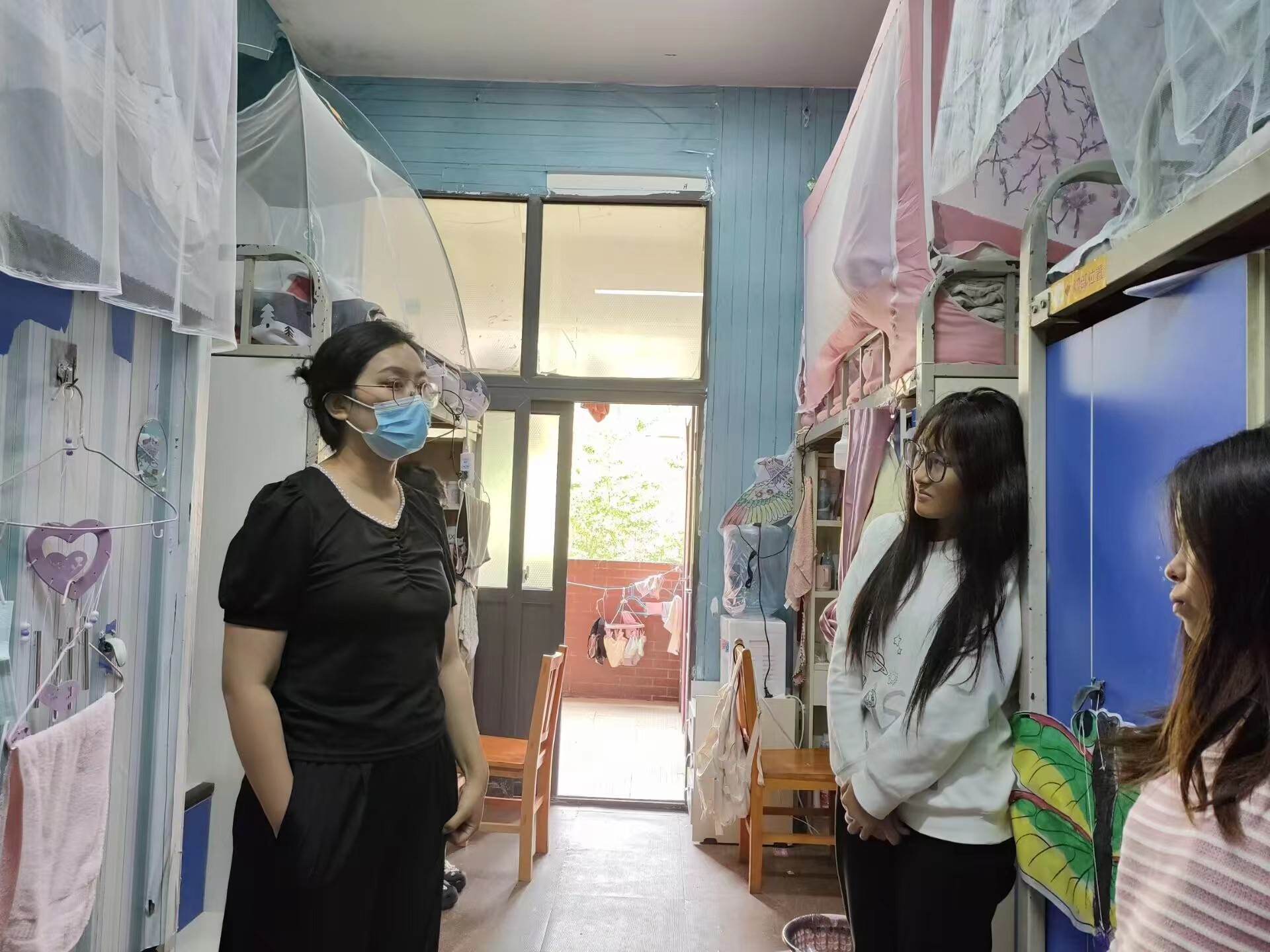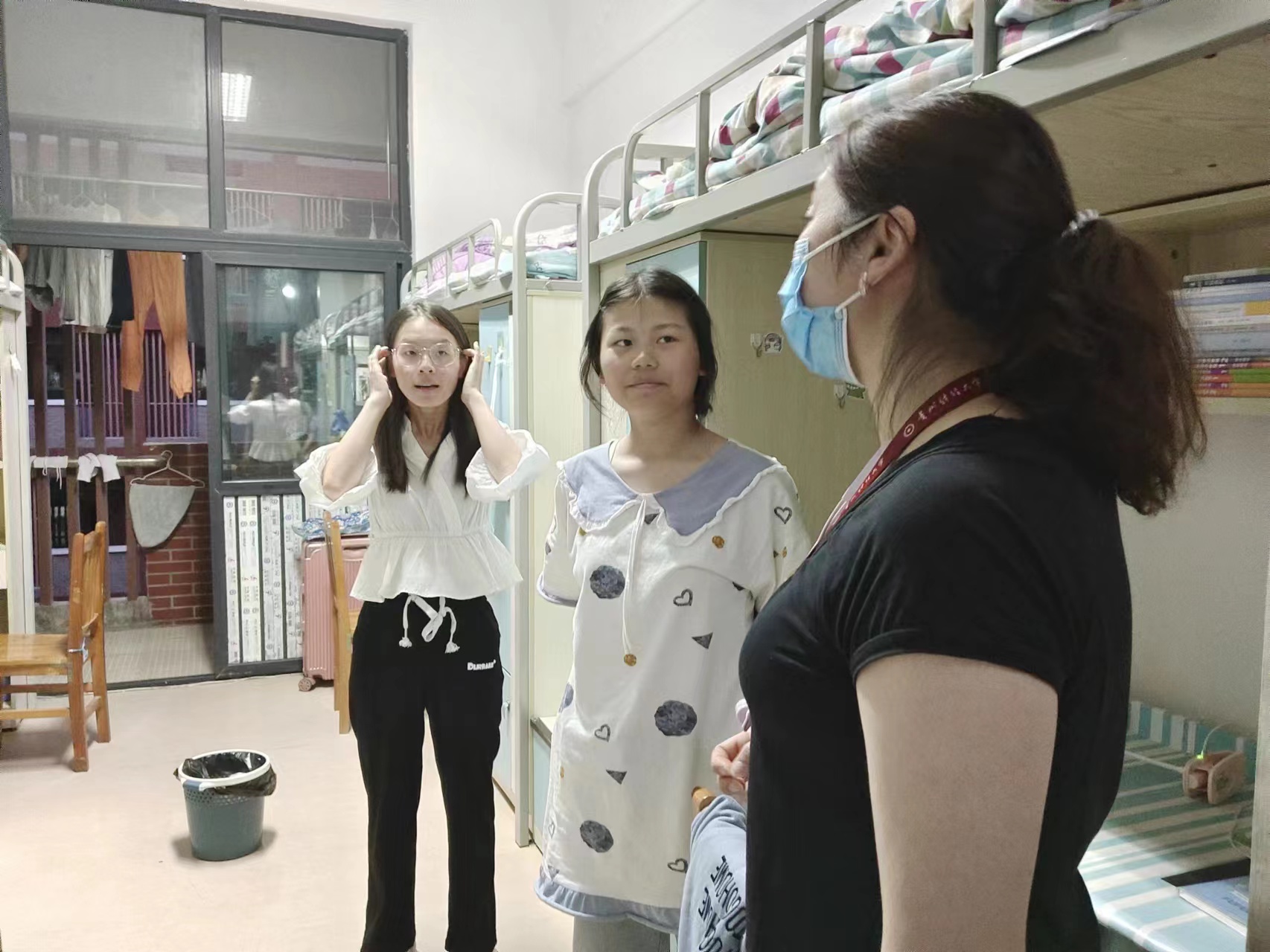 党委书记聂永刚、党委副书记黄忠莉坚持深入到各年级寝室中,始终与学生们在一起。亲切询问学生生活情况、线上听课情况,掌握学生心理变化,并及时为学生解决买药难、就医难等问题。