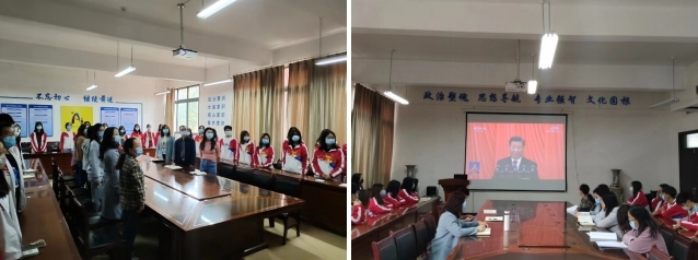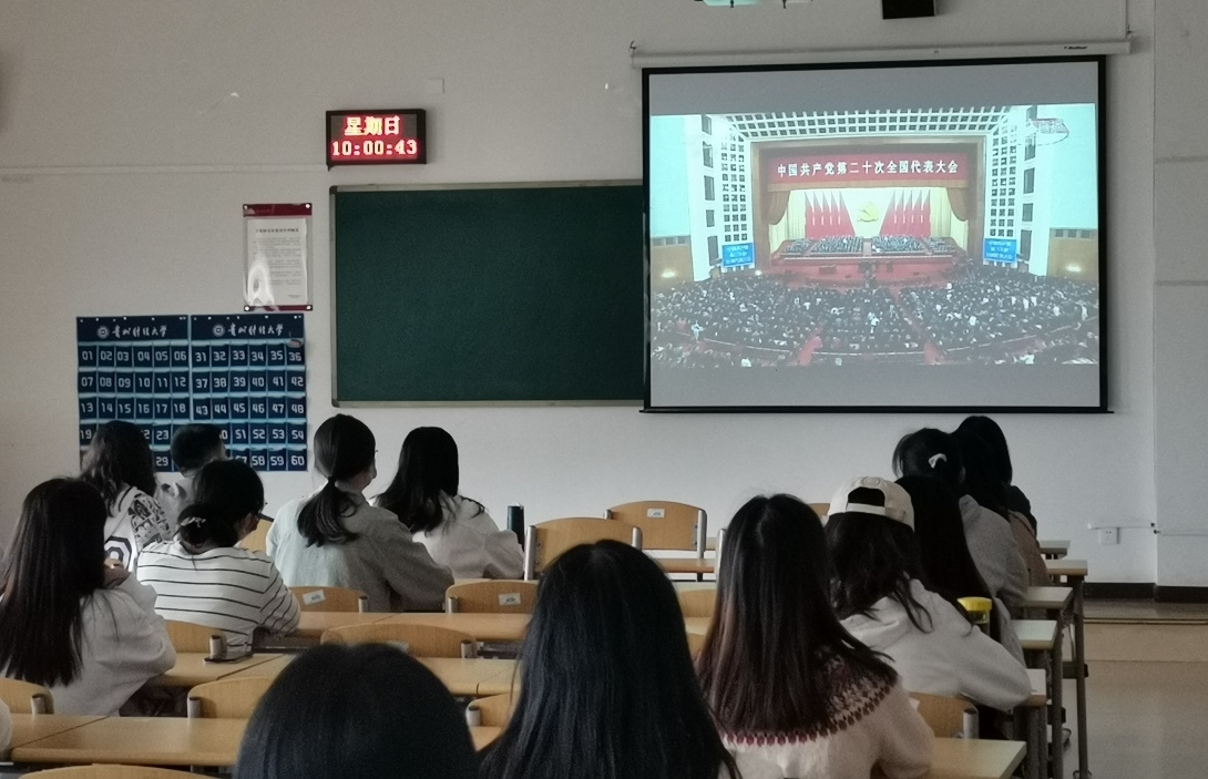 教师代表和学生代表集中收看中国共产党第二十次全国代表大会开幕会。