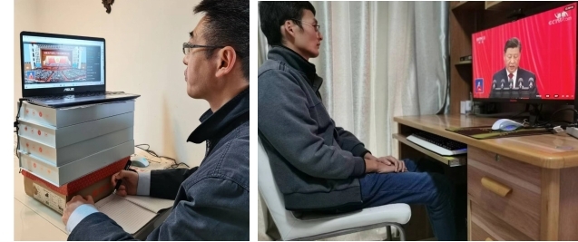 教师结合实际收看中国共产党第二十次全国代表大会开幕会。