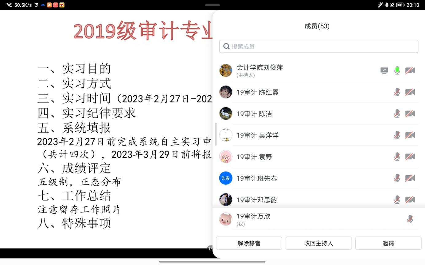 审计系通过线上方式召开2019级审计本科生毕业实习动员大会。会议由审计系系主任刘俊萍教授主持,指导教师黄晓芬及全体2018级审计本科生参加。
