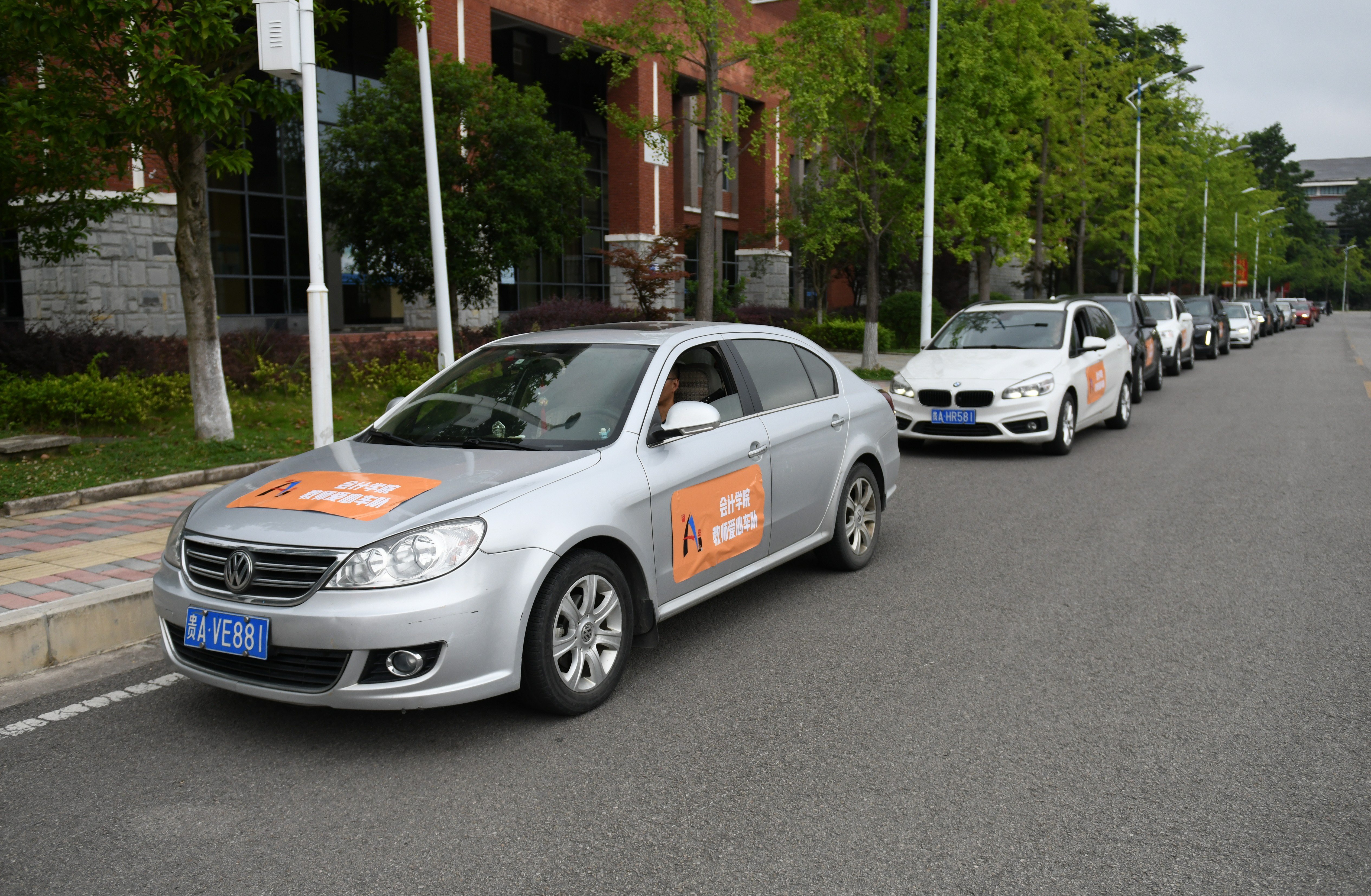 教师爱心车队”标识的车辆在崇德楼前整装待发。校长赵普、副校长葛建军到场指导工作,对hkjc下载中心