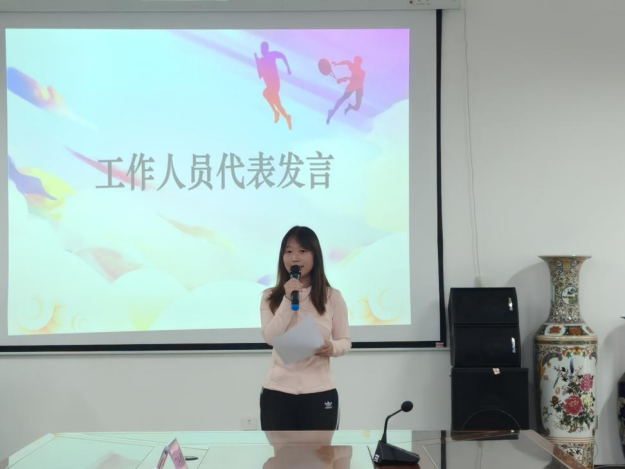学子良好的精神风貌。随后,运动员代表李思上台发言,表达了顽强拼搏、奋勇争先的坚定决心,承诺将严格遵守赛事规则,尊重裁判、尊重对手,以最佳状态迎接比赛。最后,工作人员代表谯竹婷发言,表示会以严谨负责的态度做好赛事保障、后勤服务、秩序维护等各项工作,全力配合赛事开展,为运动会的顺利进行保驾护航。