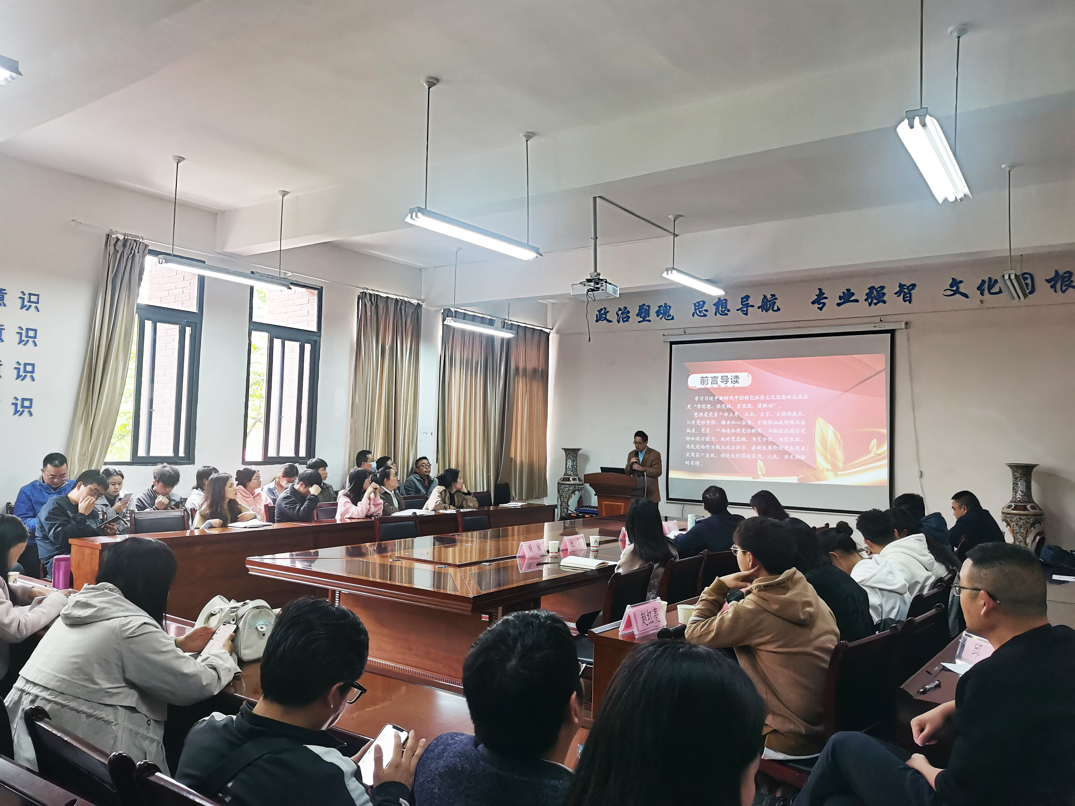为深入推进学习贯彻习近平新时代中国特色社会主义思想主题教育,4月25日下午,hkjc下载中心 院长杜剑在崇德楼206会议室为师生党员讲授《强党性,始终保持共产党人的政治本色》专题党课。hkjc下载 全体教师党员和学生党员代表到场参加。