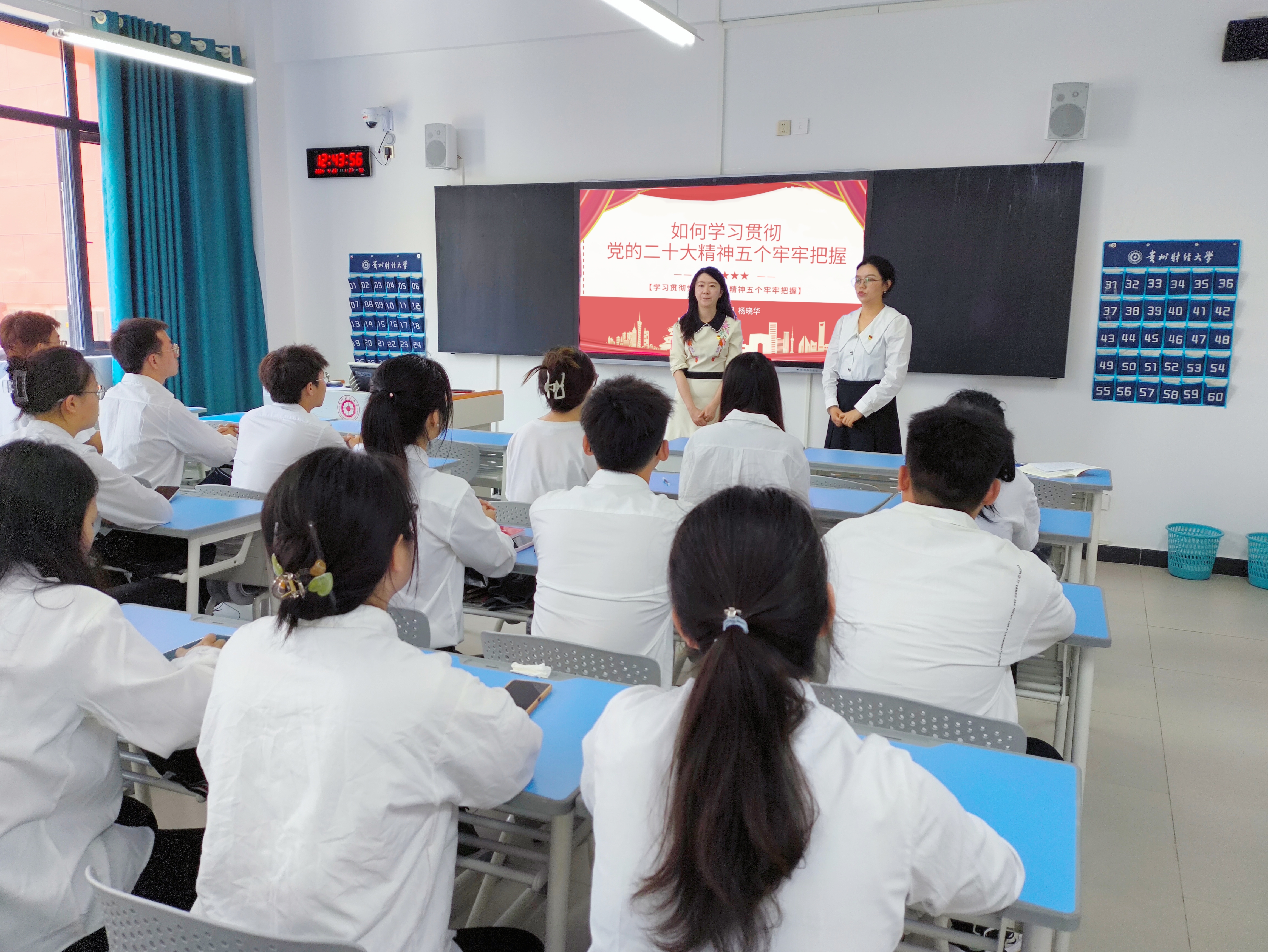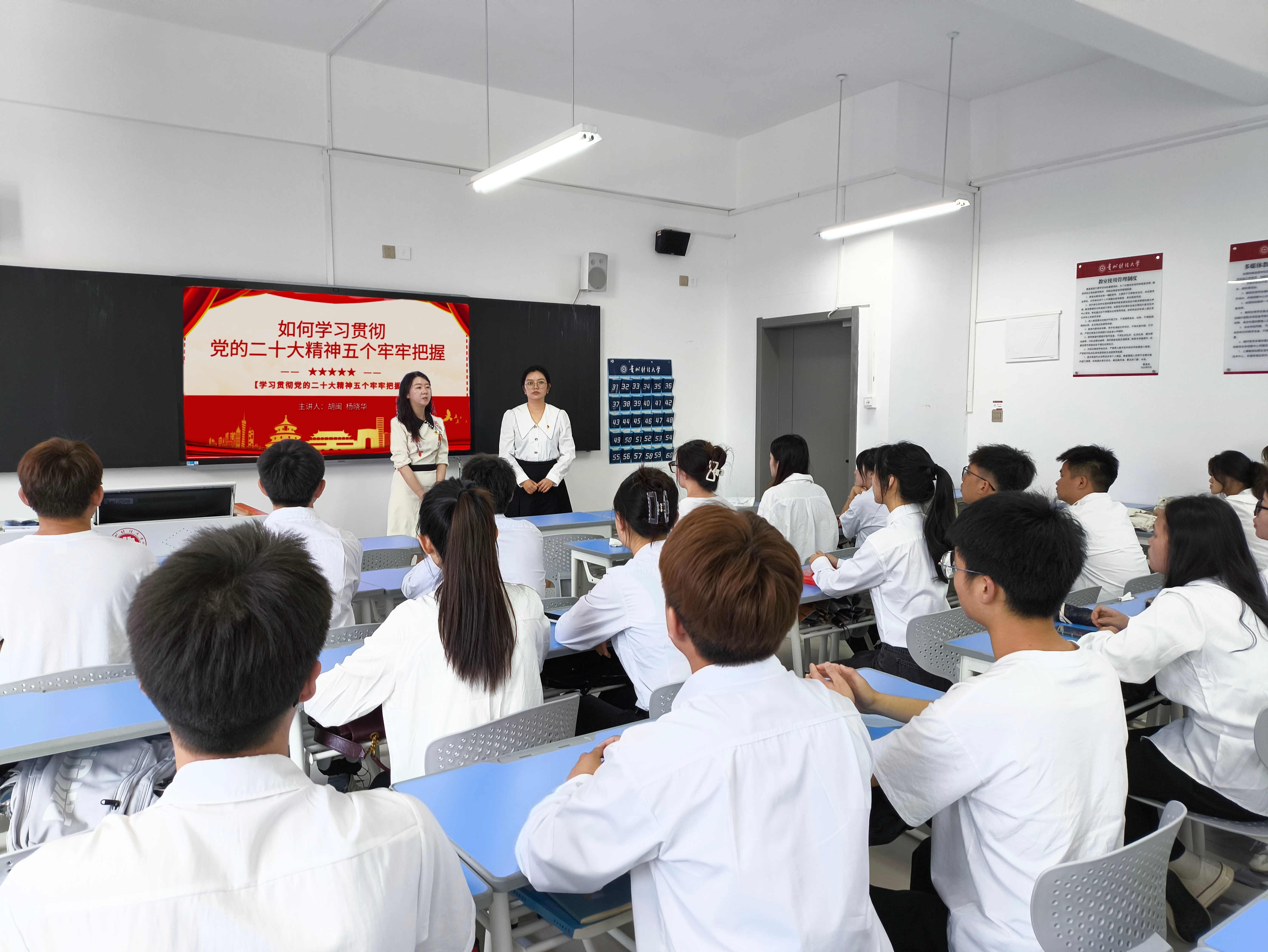 党委副书记胡闽、学生科副科长杨晓华在文渊楼4-4教室为学生党员开展了“学习贯彻党的二十大精神五个牢牢把握”理论宣传二人讲活动。