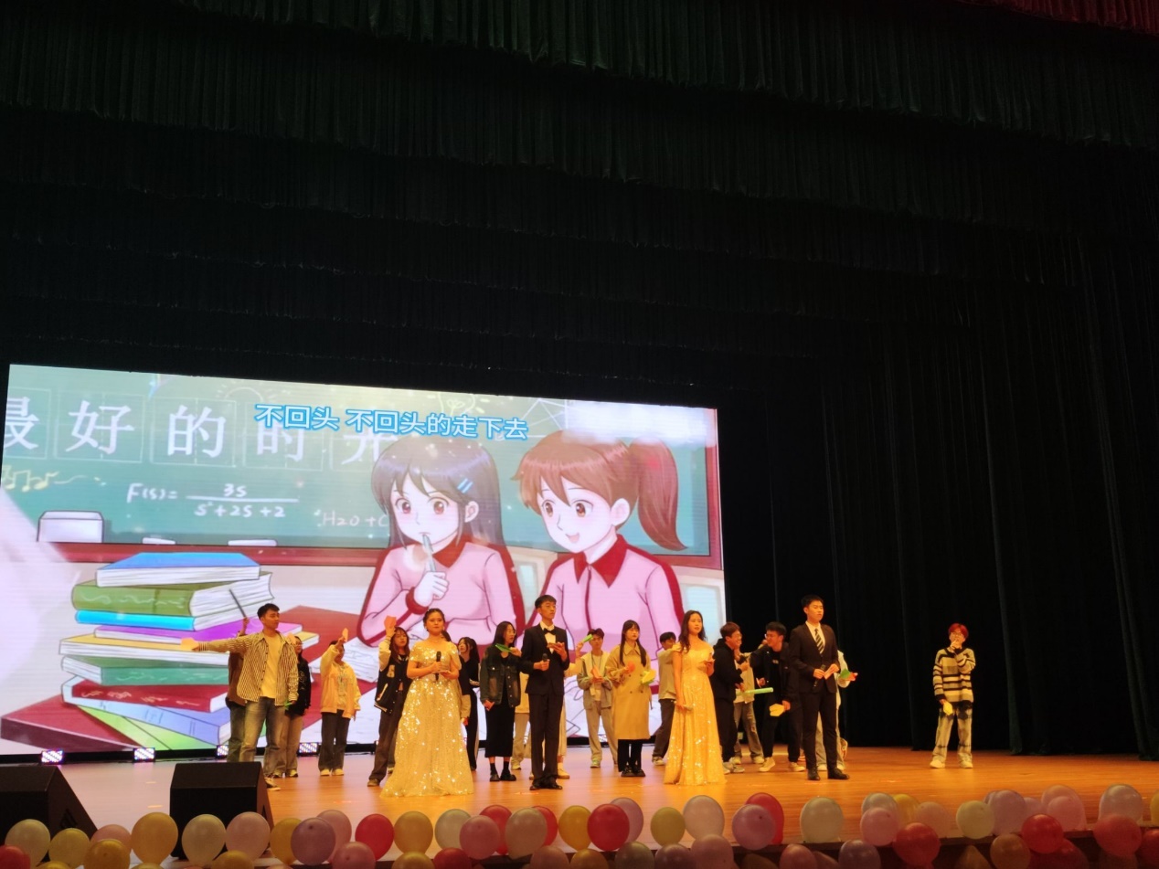 最后毕业生辅导员周芳和蒲亚晴老师上台为毕业生寄语,祝愿毕业生前程似锦,未来可期。晚会在大合唱《再见》中圆满结束
