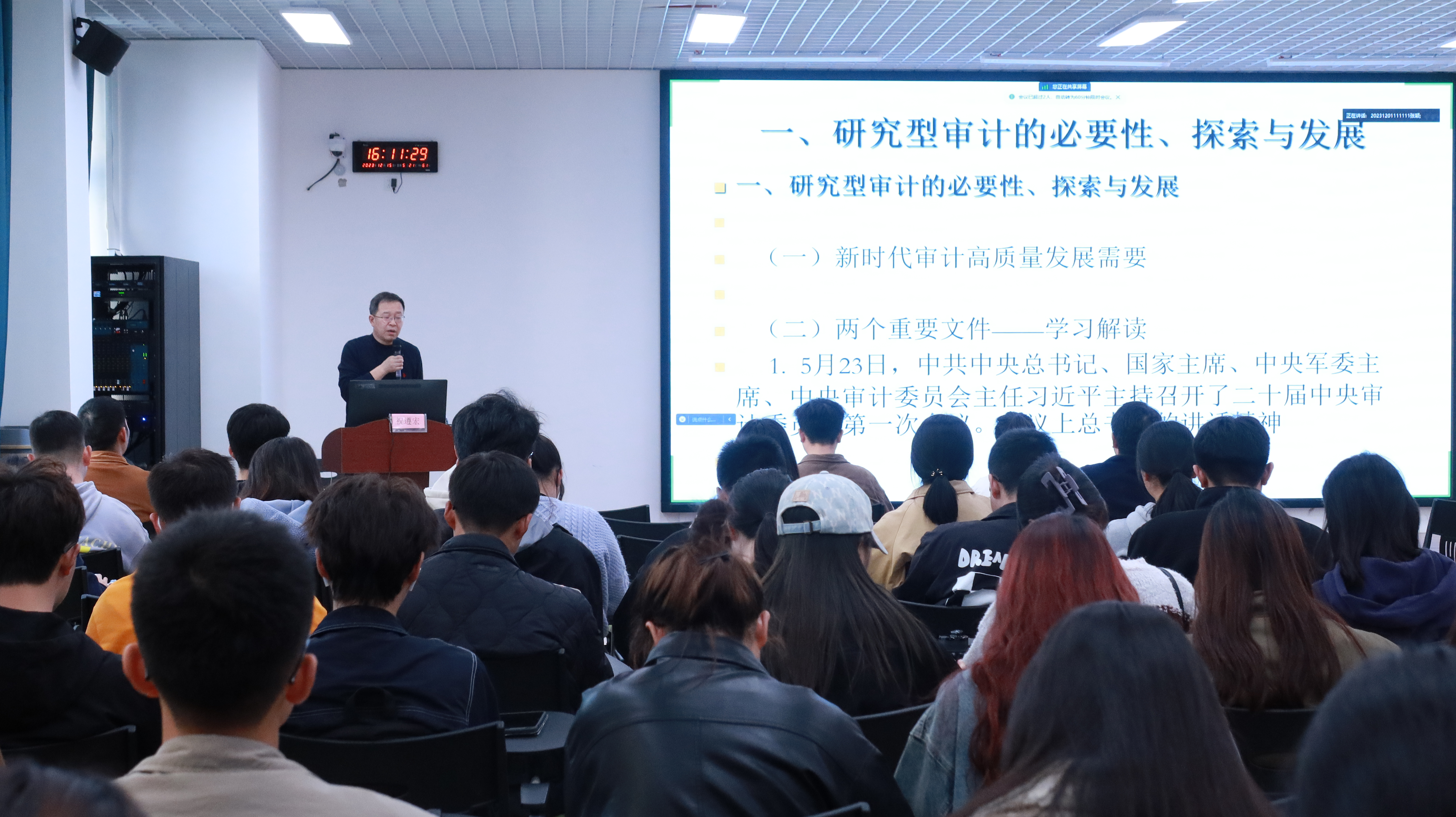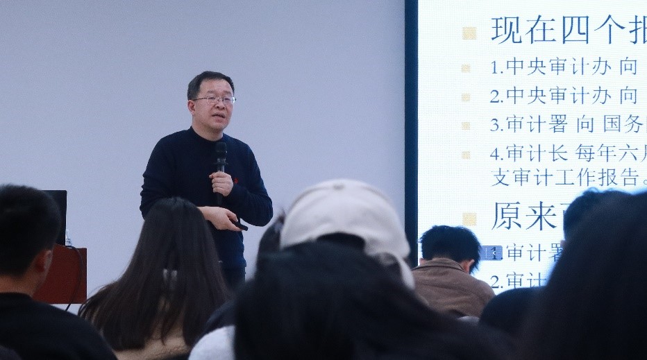 2023年12月15日,南京审计大学教授审计署国家审计指南专家委员会委员祝遵宏为研究生同学开展了题为《研究型工程审计实践与探索》的线下专题讲座。