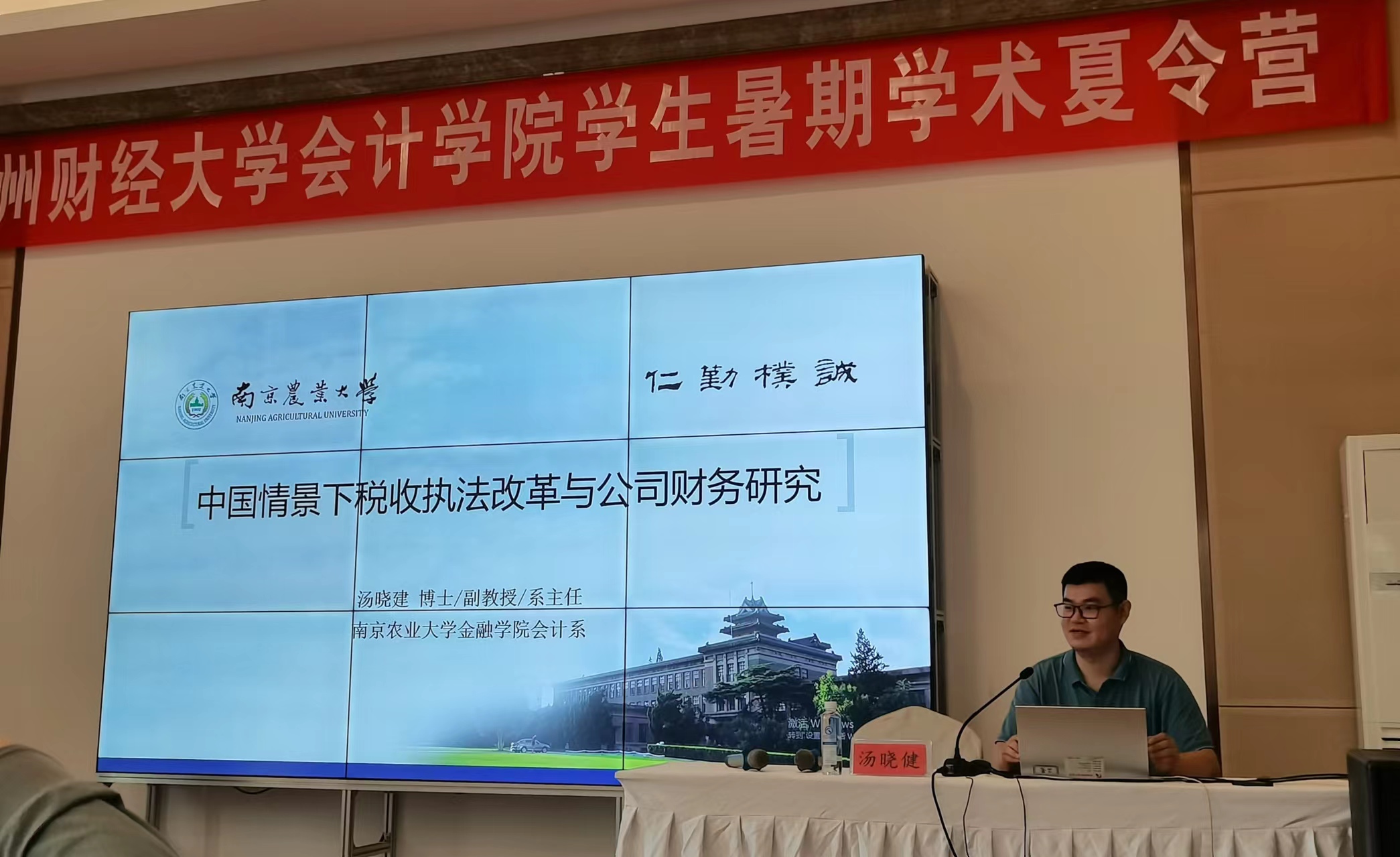 来自南京农业大学的汤晓建副教授作了《中国情景下税收执法改革与公司财务研究》的论文分享。他从不同角度梳理了我国税收法治的发展和完善历程,并结合自身的研究,向参会师生提供了极具指导意义的税收执法的选题方向。
