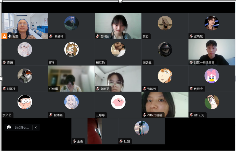 2023年7月8日, 2020级财务管理专业第一组学生在线进行第一周专业实习情况交流。四位学生代表徐雷雷、代显会、袁萧、程博涵上进行了实习情况汇报。同学们表示能够顺利度过适应期、融入实习单位的工作岗位,并对自己未来的三周实习充满信心和干劲,相信自己能在接下来的实习工作中能越做越好。