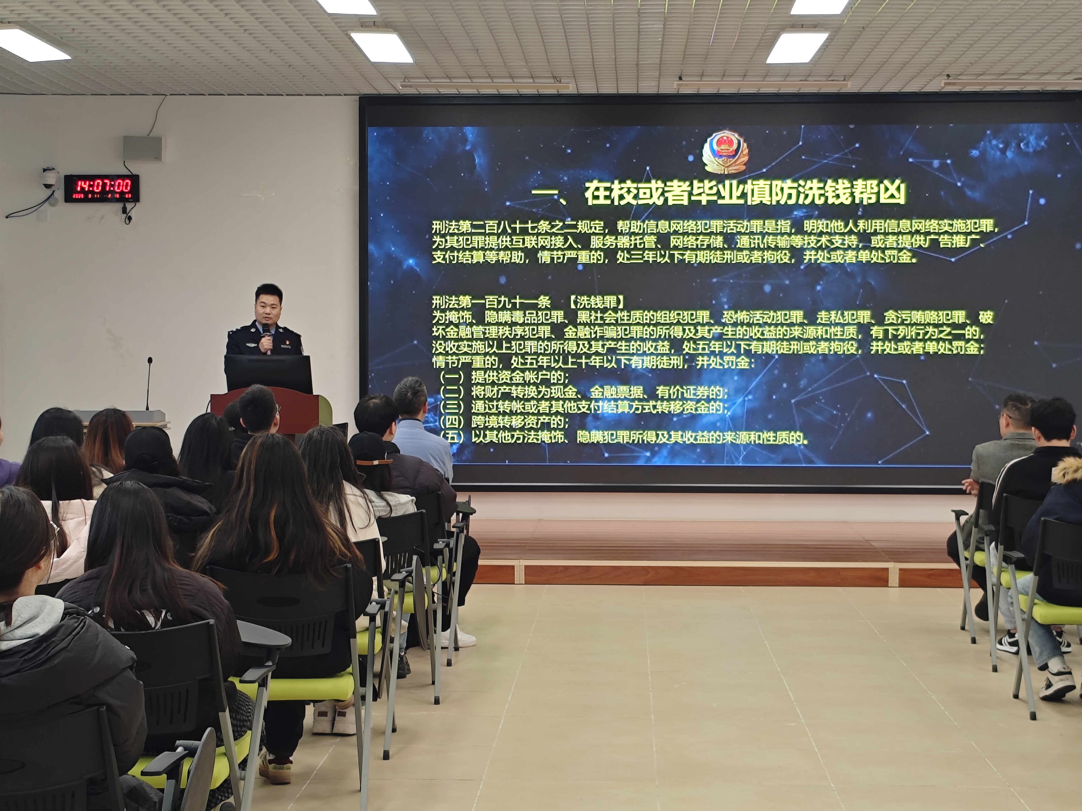 活动中,潘登桦警官首先介绍了刑法中洗钱罪和帮助信息网络犯罪活动罪的具体内容,警示在校生和毕业生应提高警惕、预防诈骗,谨防刷单等骗局,以防成为洗钱帮凶。接下来,潘登桦警官分享了财会专业毕业生的主要就业方向,并指出,无论从事任何职业,都应当遵纪守法,用正确的职业道德和职业操守规范自身。以此为切入点,他还为大家介绍了虚开增值税专用发票、逃税、非法吸收公众存款等十种会计领域职业常见的犯罪行为,并科普了四种容易引发犯罪风险的错误认识及风险。